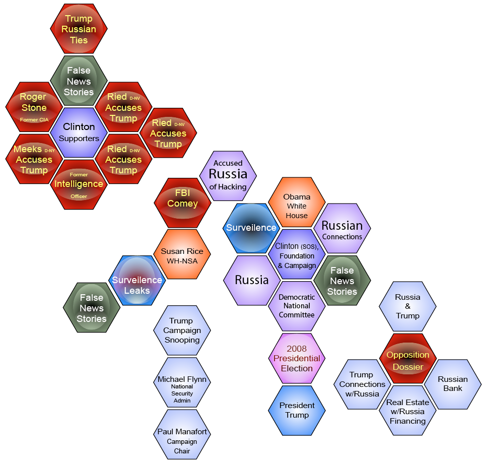 We've put a small amount of distance between key components of the news feeds and story lines related to Trump and Russia. This attempts to separate fact and fiction allowing a better conceptual picture of the players involved. This visually documents the efforts Democrats have taken to discredit President Trump. Activities innitated shortly after winning the Republican Nomination in May 2016. The effort Democrats take usually involve misdirection and disinformation from key Democrat Leaders and the Media.